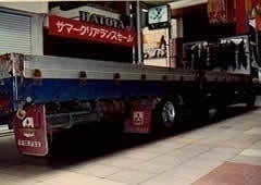 MMCミラージュ社中は、社員が一丸となって地方車を造る楽しいチームだった。納車前の規定枠いっぱいの超ロング低床トラックを見つけてきて、社員自らがスピーカーを取り付けるための枠を溶接。枠?このチームは音を遠くまで飛ばすことより地方車の見た目を重視!デザインの為ならスピーカーを下げる!いいかげん長い車が枠のとりつけでますます長くなる。11mを超えていたのでは?それでも3.5tトラック(笑)それでも当時は規定内の車、バイクやボートを運ぶ為の特別な車両らしい。