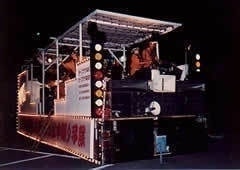 地方車は舞台をイメージしたデザイン。当時、どの地方車もなし得ない舞台照明を取り付け、昼間の祭りだったよさこいが華やかな夜の祭りとなった。夏祭りで露天の電球に蛾が寄ってくるように、踊り子が地方車に群がった。パーライト6台。工事用のライト数台を使うのが主流だった時代にそれはとてつもなく明るかった。