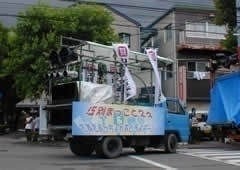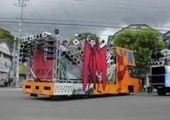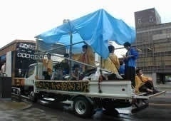 10日8時過ぎ、踊り子がちらほら集まり始める。あれー地方車は?例年はどうだ!とばかり飾り付けを終えた地方者が踊り子を向かえその前で記念撮影するのが流れだった。そこへ装飾だけされた地方車がさびしく到着!踊り子が見守る中、私は狂ったように動いた「ちょっとそこの人 これやってー」「それとってー」 怒鳴り散らしてぎりぎりで完成!10時過ぎ音響のテストをする間もなく出発した。