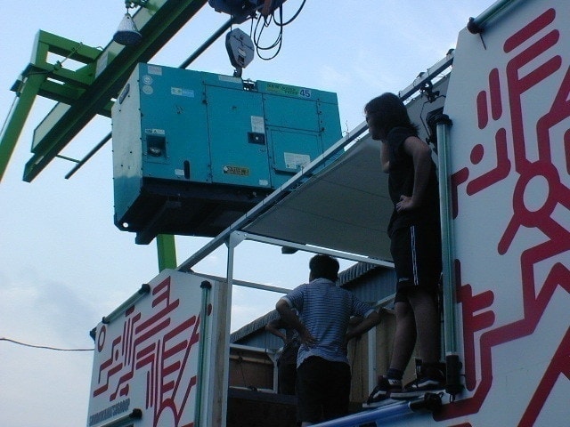 見た目がよくないと発電機を布で覆ってしまうチームを時々目にします。発電機は煙突部の周辺だけが吸排気口でなく本体の周囲にも吸気口があるので気を付けてください。肝心な時にオーバーヒートして直ぐに再始動できなくなります。万が一のトラブルに備え、発電機周辺は綺麗にし、扉を開けるなどメンテができる状態にしておきましょう。また、発電機の修理ができない場合、交換で対応することに備え地方車を設計しましょう。それも出来ない場合は人力で積載できる5KVA前後の発電機を複数台用意し音響だけでも動かしましょう。