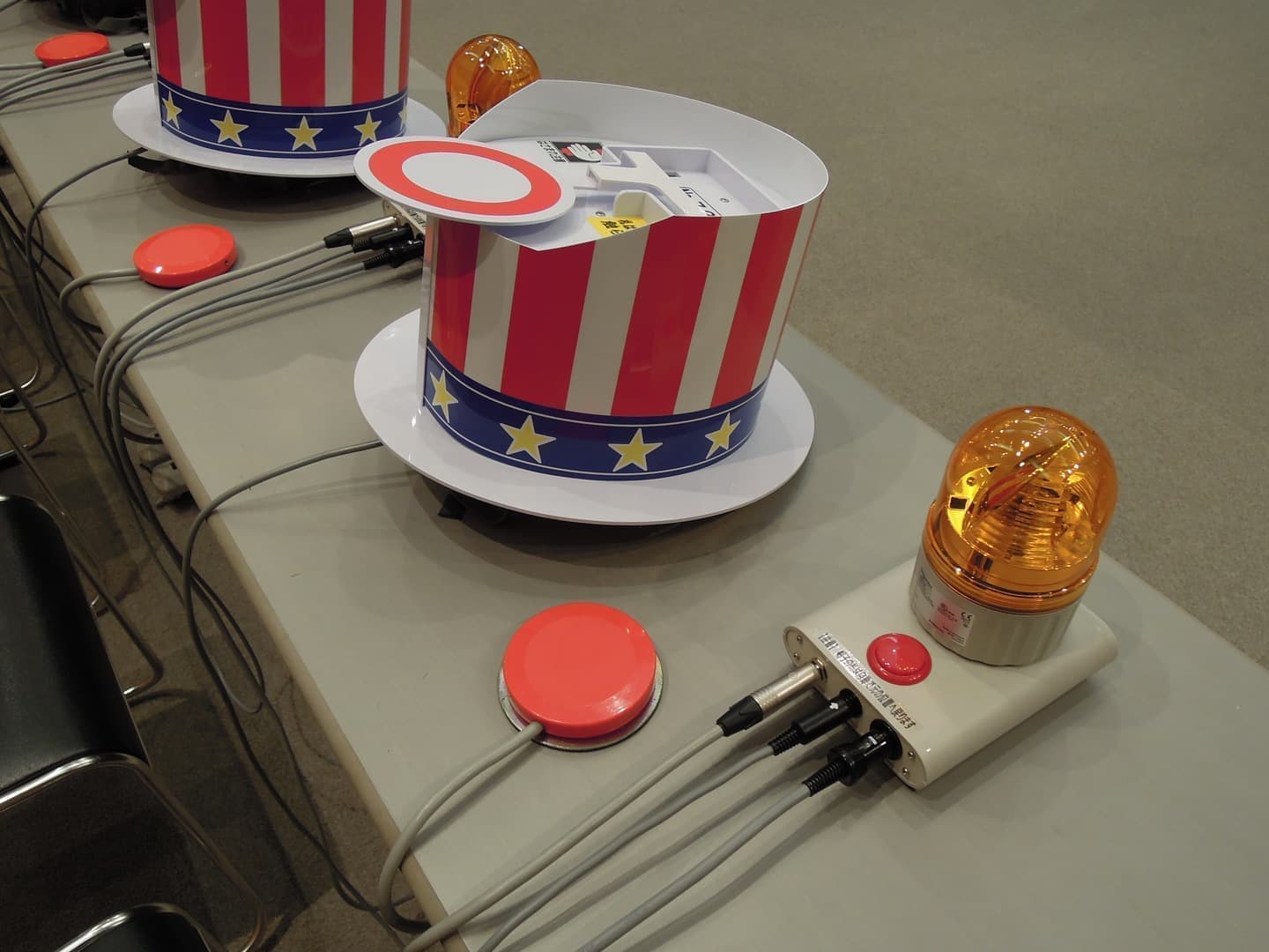 - [ 感想 ]小学校の周年事業のイベントで利用させて頂きました。他社レンタル品を使った事がありますが、今回は予算もしっかり取れたのでこちらの早押し機を使わせて頂きました。ハット付きなので回転等だけに比べ圧倒的な存在感があり、操作部分もかなり使いやすくクイズ大会のクオリティが一段とあがり大変喜ばれました。非常に満足です。
