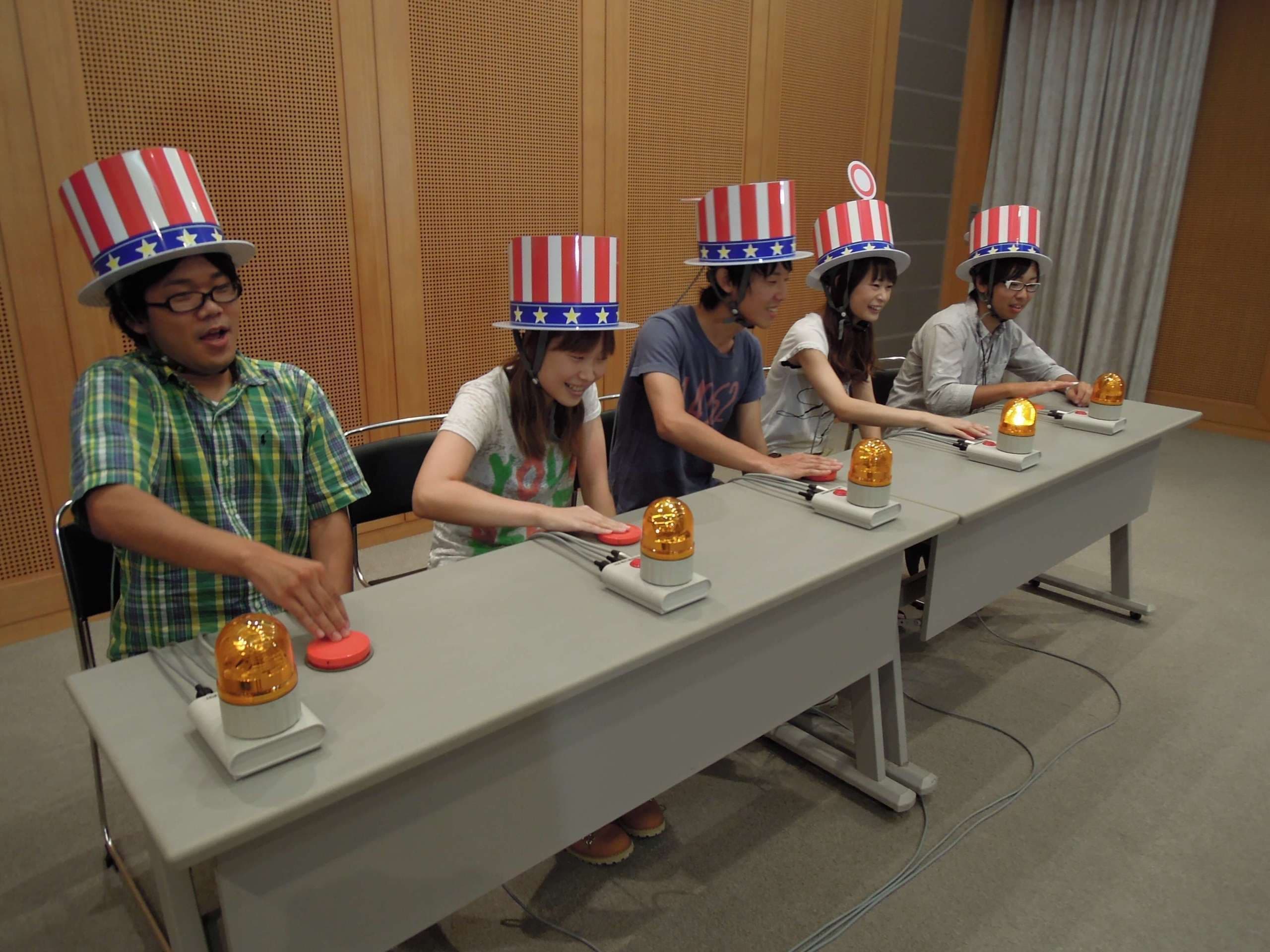 ステージ形式の場合、アクションハットはステージ袖で脱着を行うことで、少ないスタッフでも短時間に対応でき、アクションハットのかぶり具合や可動部への手のはさみ込みなどの注意説明に余裕をもって当たることができます。解答者が席に着いたらスタッフが回転灯スイッチボックスへアクションハットからのコードを接続します。