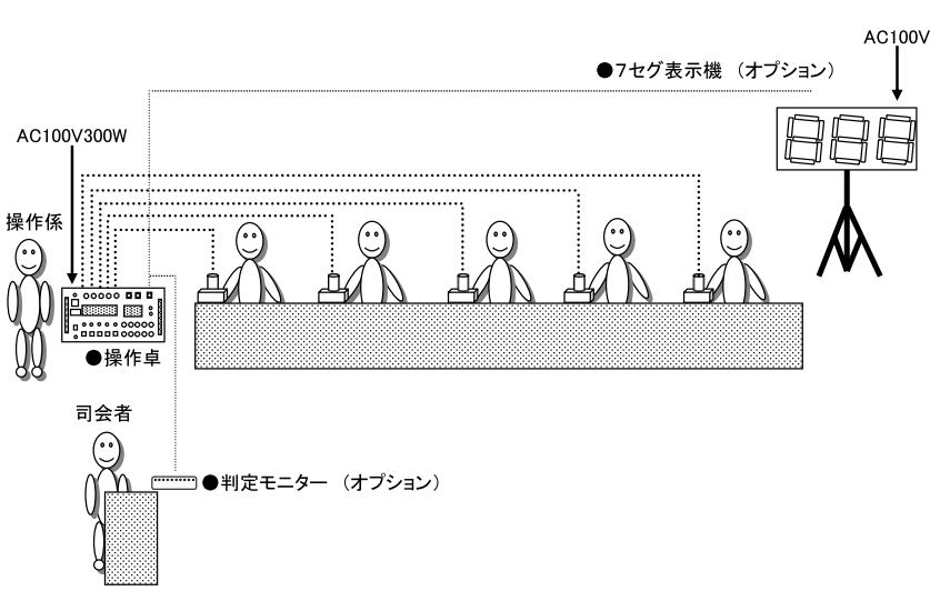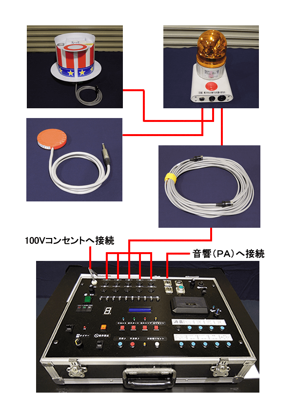 ※5人の回転灯BOXからの配線が操作卓のコネクタ(1番から10番)のどこに接続されていてもゲームは行なえます。操作卓の表示が席順と一致しないだけです。一致させる場合は、ケーブルの両端にテープ等を貼り1番から5番の番号を書いて回転灯BOXへ接続した1番のコードは操作卓の1番に差し込むようにしてください。